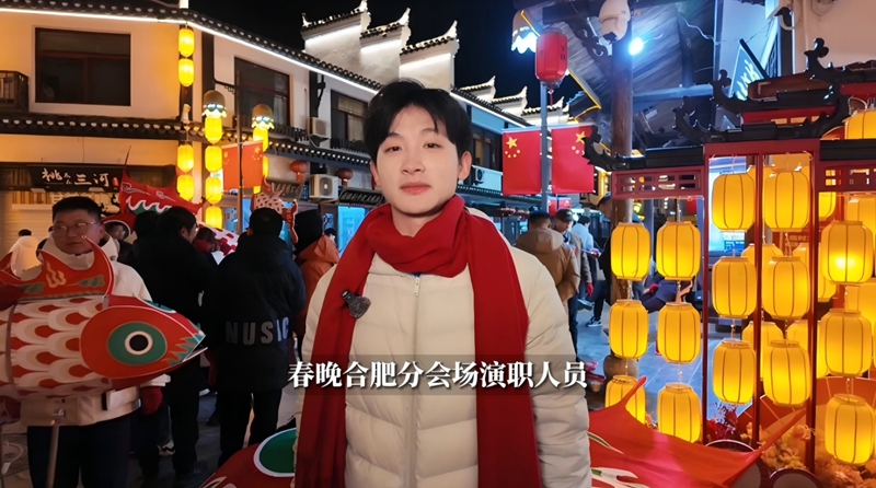 位于合肥肥西的三河古镇,是小南河畔的明珠,也是此次春晚合肥分会场的重要取景地。合肥职业技术学院学子在此承担了极具徽风皖韵的“鱼灯巡游”拍摄任务。时值寒冬腊月,同学们佩戴校团委统一采购的围巾、手套,手持数斤重的鱼灯,一遍遍穿行于古镇的古街古巷、青石板路。为了呈现“鱼游古镇、千灯迎春”的唯美画卷,他们无畏严寒,通宵达旦地排练。寒风冻僵了手指,却冻不住他们眼中对完美的追求。当一盏盏鱼灯亮起,光影在斑驳的粉墙黛瓦间流动,青春的身影与千年的文脉交相辉映,将安徽独特的非遗魅力生动地传递给全球观众。