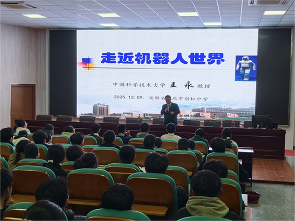 12月9日,“百名专家乡村学堂讲科普”活动走进宿松中学,中国科学技术大学教授、自动化系博士生导师王永,在校图书馆报告厅为全校学生带来一场主题为“走进机器人世界”的科普讲座。