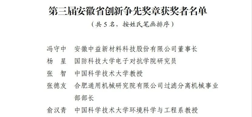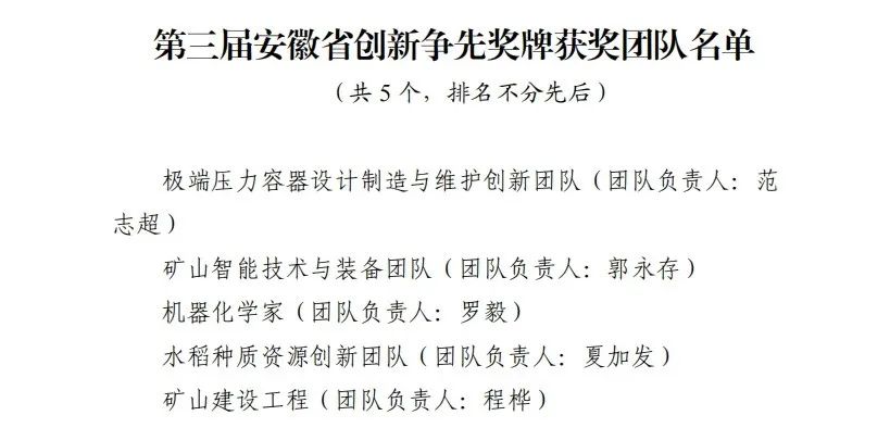 为进一步表彰我省在面向世界科技前沿、面向经济主战场、面向国家重大需求、面向人民生命健康和社会服务等相关科技创新领域作出突出贡献的个人和集体,省人力资源和社会保障厅、省科学技术协会、省科学技术厅、省人民政府国有资产监督管理委员会决定,授予极端压力容器设计制造与维护创新团队等5个团队第三届安徽省创新争先奖牌,授予冯守中等5名同志第三届安徽省创新争先奖章,授予王英俭等20名同志第三届安徽省创新争先奖状。