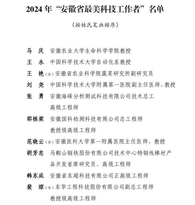 经过广泛动员、有关单位推荐、专家评选、面向社会公示等环节,决定授予马庆等10位同志2024年“安徽省最美科技工作者”称号。