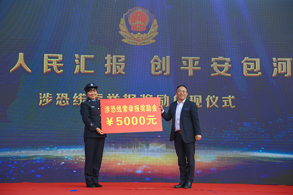 活动的最后,合肥市公安局包河分局还在现场举行了隆重的疑似涉恐线索举报奖励仪式,在仪式上,合肥市公安局包河分局对举报有功的群众兑现了5000元的奖励,受到奖励的群众表示,协助公安机关举报涉恐涉暴线索,是每个公民应尽的义务。今后会进一步提高反恐安全防范意识,注意发现涉恐涉暴线索,积极向公安机关举报,共同维护省会安全稳定。