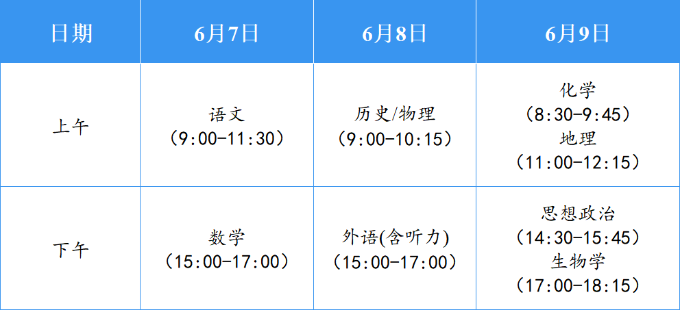 语文考试时长为150分钟,数学和外语(含听力)考试时长为120分钟,各选考科目考试时长均为75分钟,具体时间安排如下: