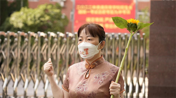 合肥九中考场一家长穿旗袍手拿向日葵,祝孩子高考旗开得胜,一举夺魁。