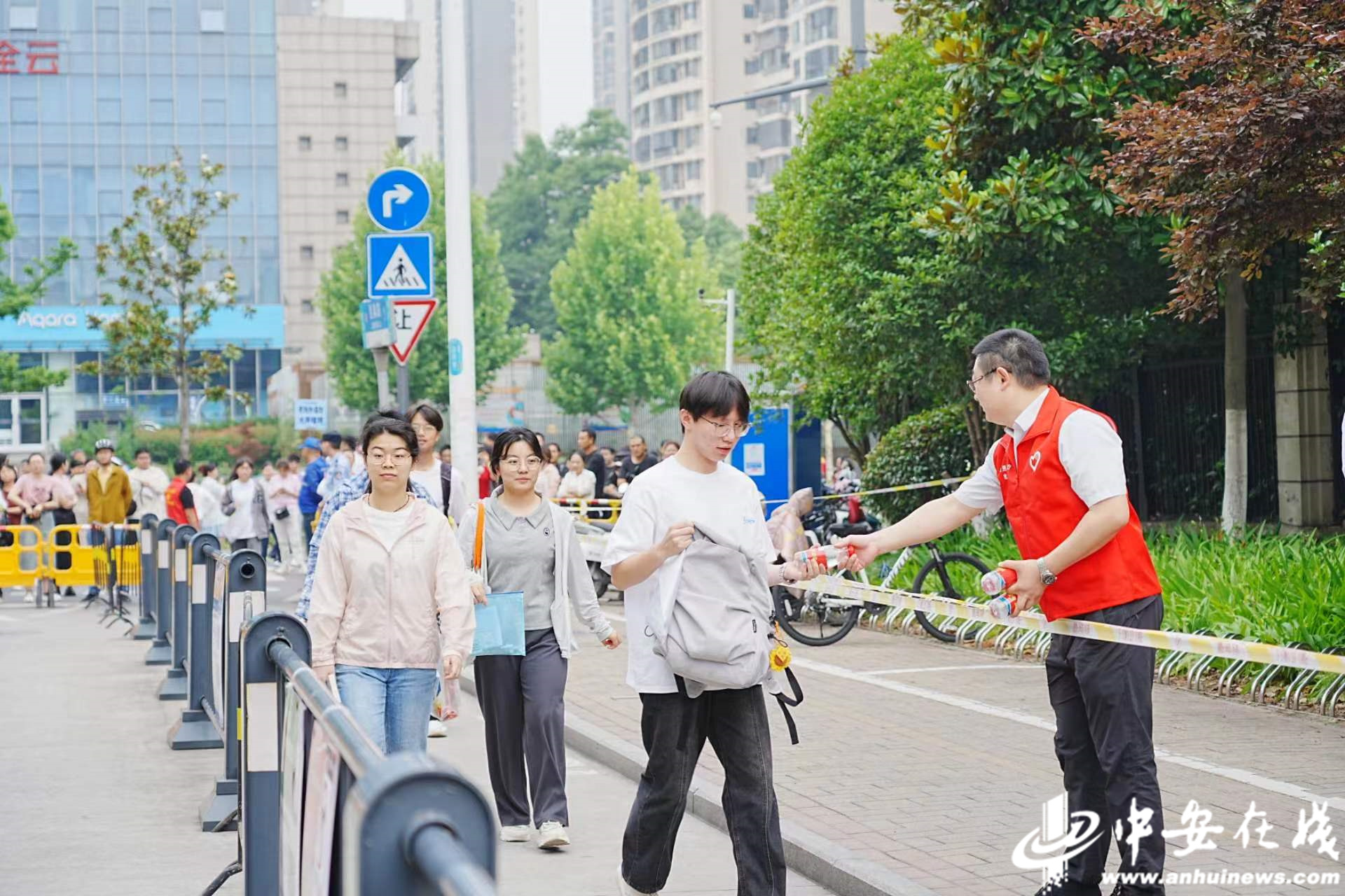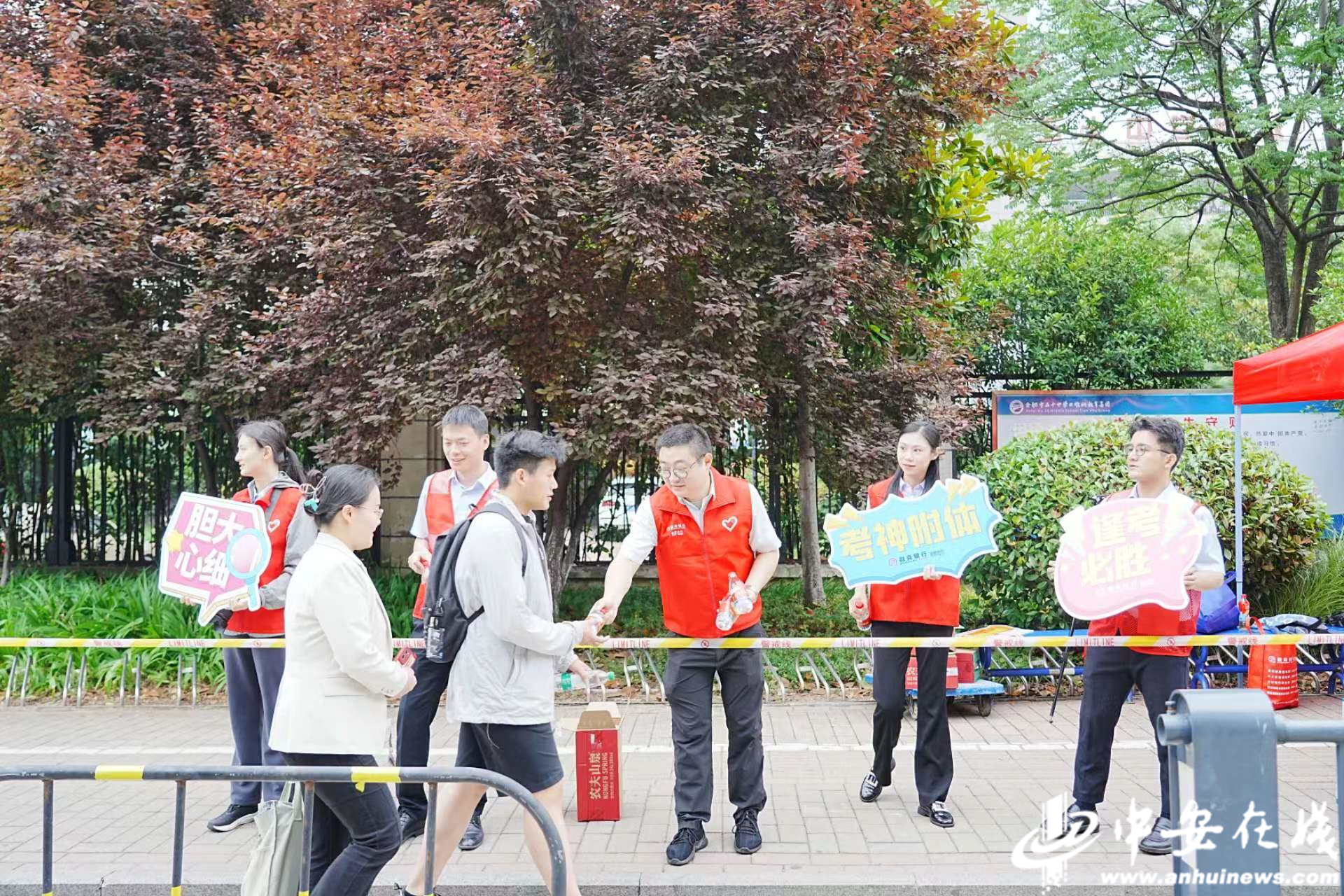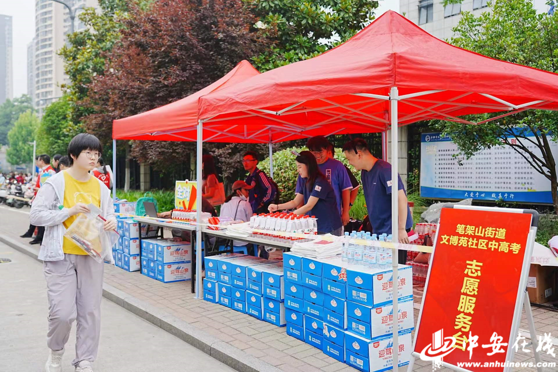 高考,不是一个人的战斗。在合肥五十中天鹅湖校区考点,笔架山街道文博苑社区的志愿者为高考提供保障服务,贴心地为考生准备了矿泉水、铅笔、尺子、雨衣等物品。(记者 吕文卫 许梦宇)