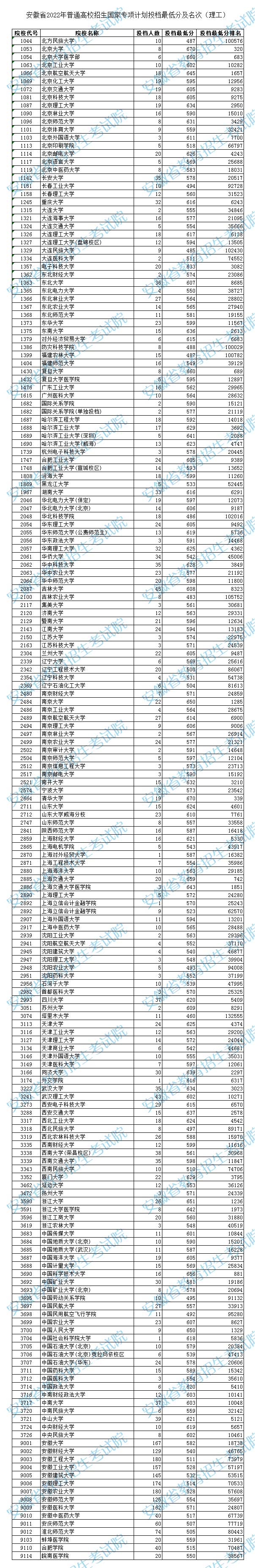 安徽省2022年普通高校招生国家专项计划投档最低分及名次(理工)