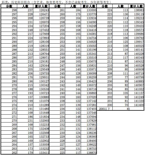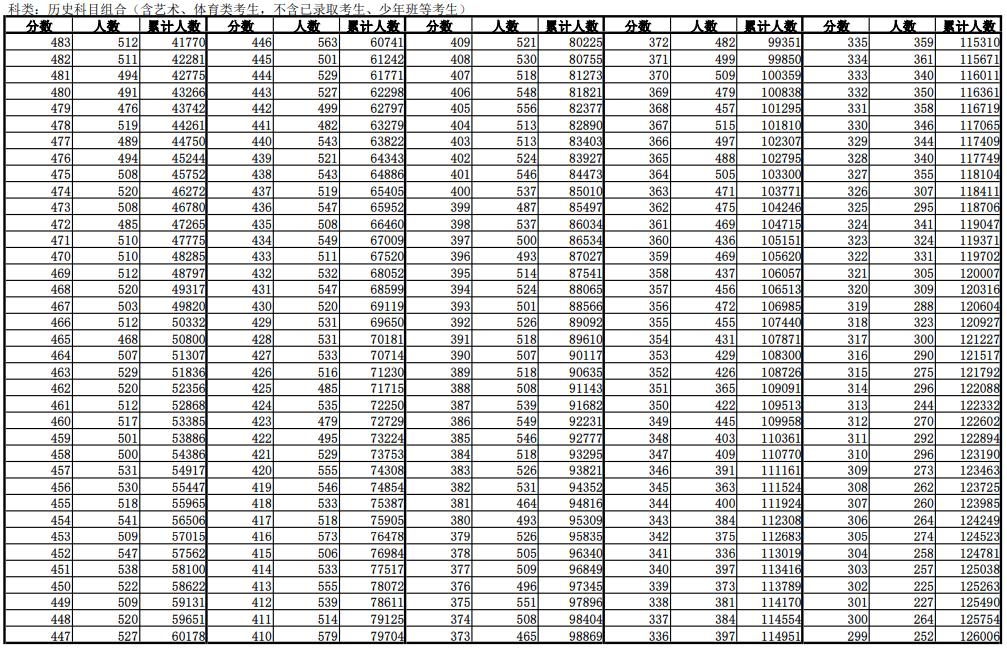 历史科目类分段表(含加分)(含艺术、体育类考生,不含已录取考生、少年班等考生)600分以上3415人,历史类本科录取线477分以上44750人。