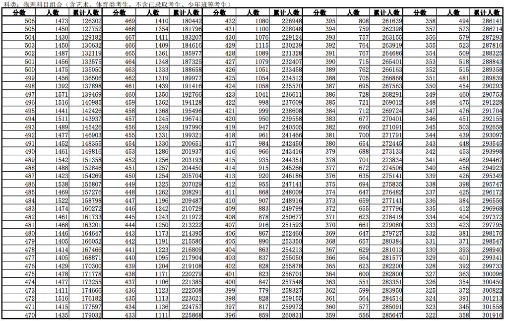 物理科目类分段表(含加分)(含艺术、体育类考生,不含已录取考生、少年班等考生)650分以上的考生4149人,物理类本科录取线461分以上191416人。