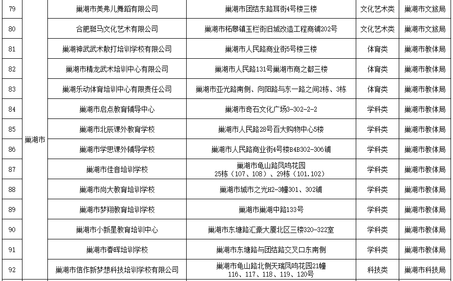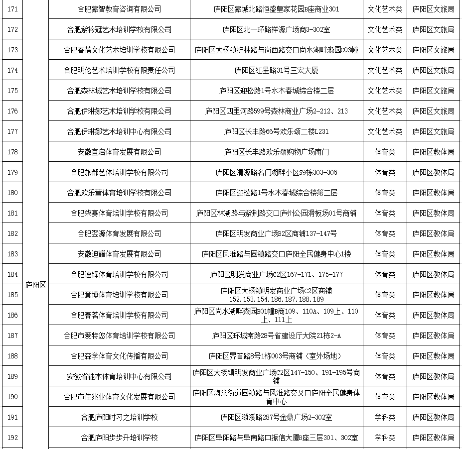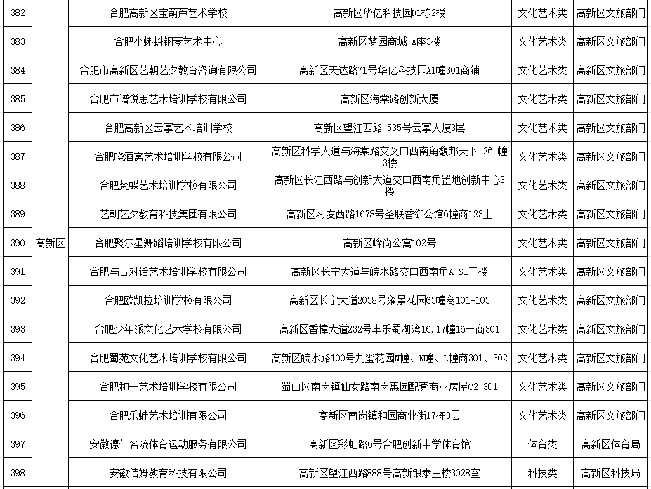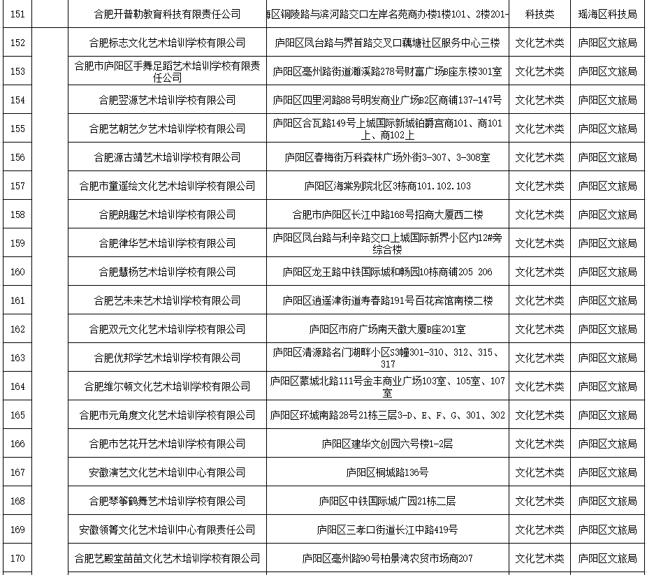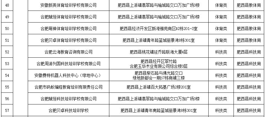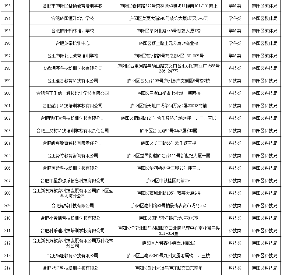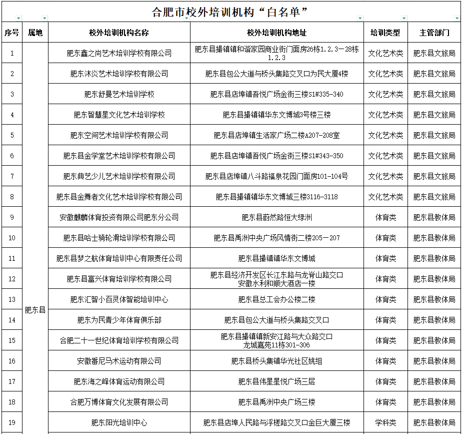在此,我们真诚提醒广大家长:尊重孩子的成长规律和教育规律,保障孩子睡眠、运动和自主成长空间,如确有需要,请根据孩子的兴趣爱好和实际需求,科学理性选择“白名单”中的校外培训机构。请通过“全国校外教育培训监管与服务综合平台校外培训家长端”APP,或到现场查看培训机构是否公示有效证照(学科类培训机构查看办学许可证,非学科类培训机构查看设立核准书、民办非企业法人登记证或营业执照)、培训内容、教师资质、收费情况,查看机构办学地址是否与审批地址一致。凡未列入合肥市“白名单”的校外培训机构,均未经有关部门审批设立,请广大家长认真鉴别,避免自身合法权益受损。