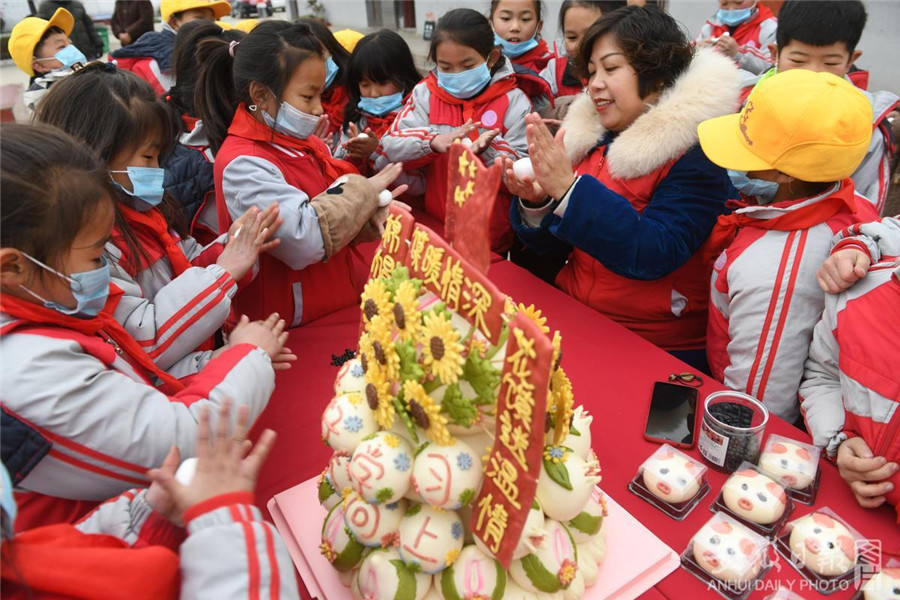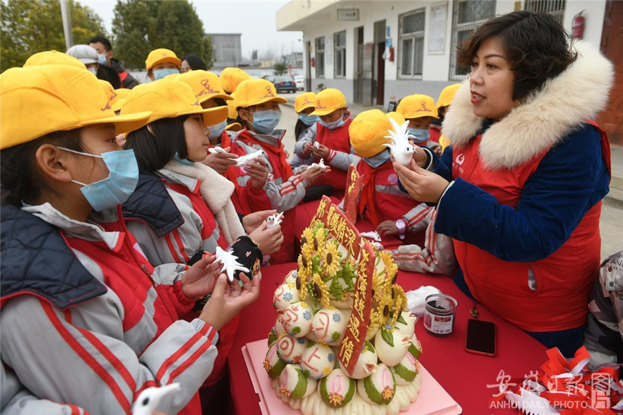 12月17日,阜阳市关爱“三留守”志愿者协会开展“非遗花馍进校园、感受指间美食魅力”主题活动,邀请本市太和县民间手工艺人李雪艳,带上制作的“馍暖情深”花馍作品来到太和县赵集乡齐老营小学,向小学生们展示和传授县级非物质文化遗产“花馍”技艺,让孩子们从小接受传统文化的熏陶,激发了他们热爱家乡、弘扬和传承传统文化的兴趣。特约摄影 王彪