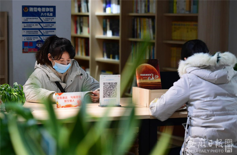 2021年1月2日,元旦假日期间,肥西县上派镇许多居民带着孩子走进社区书吧和图书馆看书阅读,乐享书香假日。通讯员 徐勇 摄