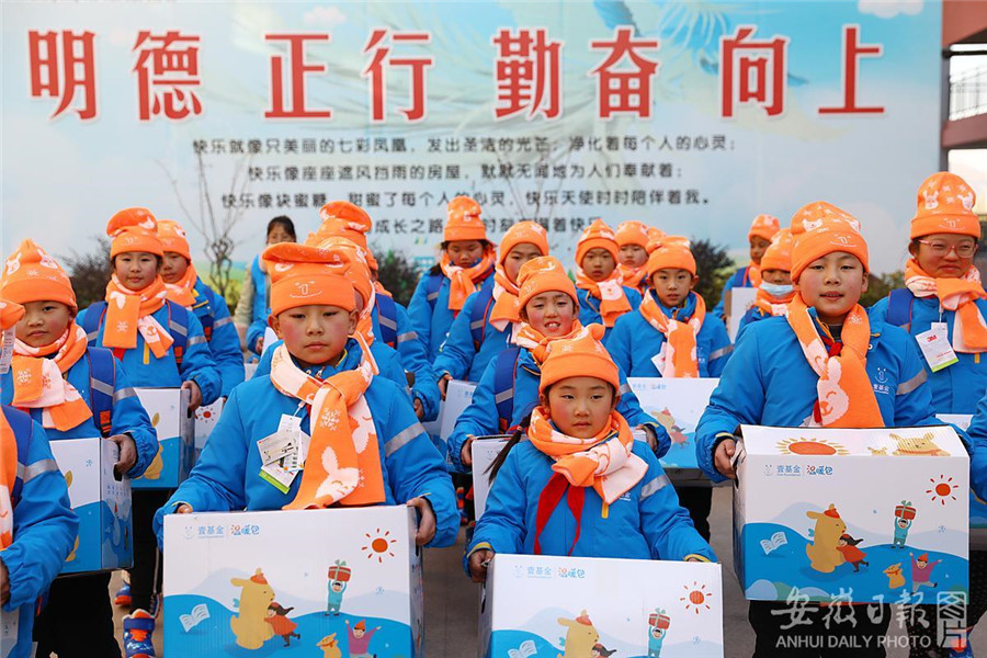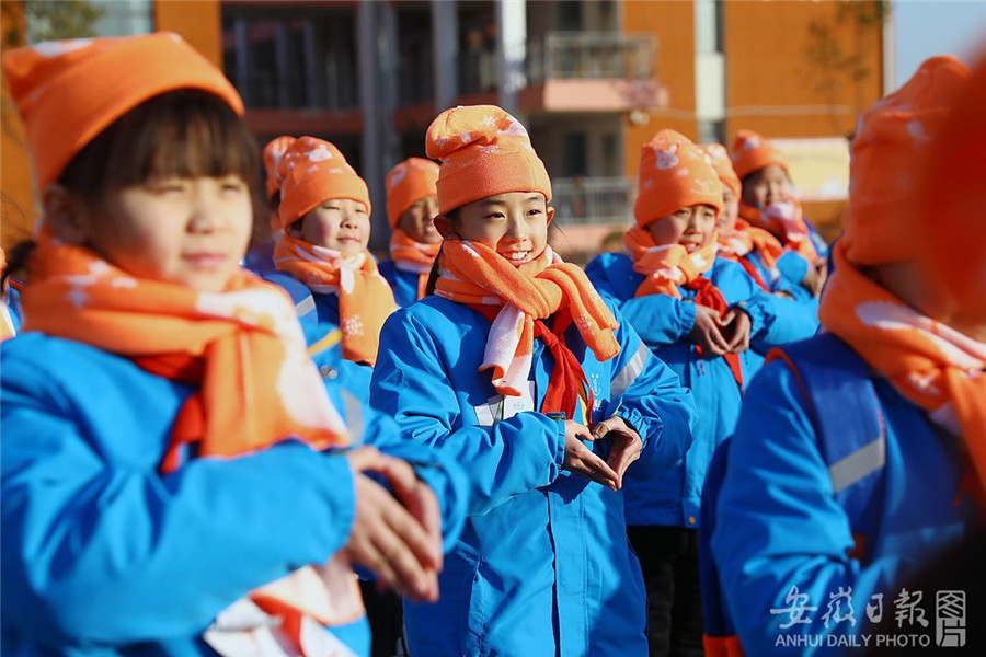 1月8日,安徽省淮北市蒲公英公益协会的志愿者来到烈山区烈山镇中心学校,为乡村孩子们发放包括棉衣、帽子、围巾、棉鞋、书包等物品的壹基金“温暖包”,让孩子们在寒冬时节感受温暖。通讯员 万善朝 摄