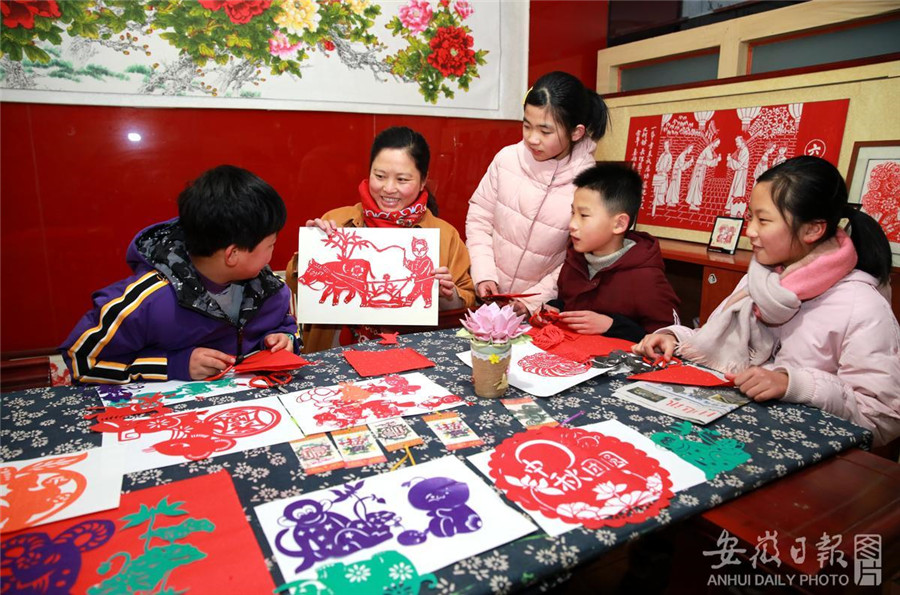 2021年1月7日,在安徽省桐城市的一家剪纸工作室,市级非遗项目桐城剪纸的传承人薛海霞(中)在指导孩子们剪纸。当日,安徽省桐城市北街小学以传承非遗文化为理念,把非遗传承与学校社团活动有机结合,让学生们在社团活动中体验剪纸技艺、参观剪纸作品、感受剪纸文化的魅力。通讯员 江胜 潘月琴 摄