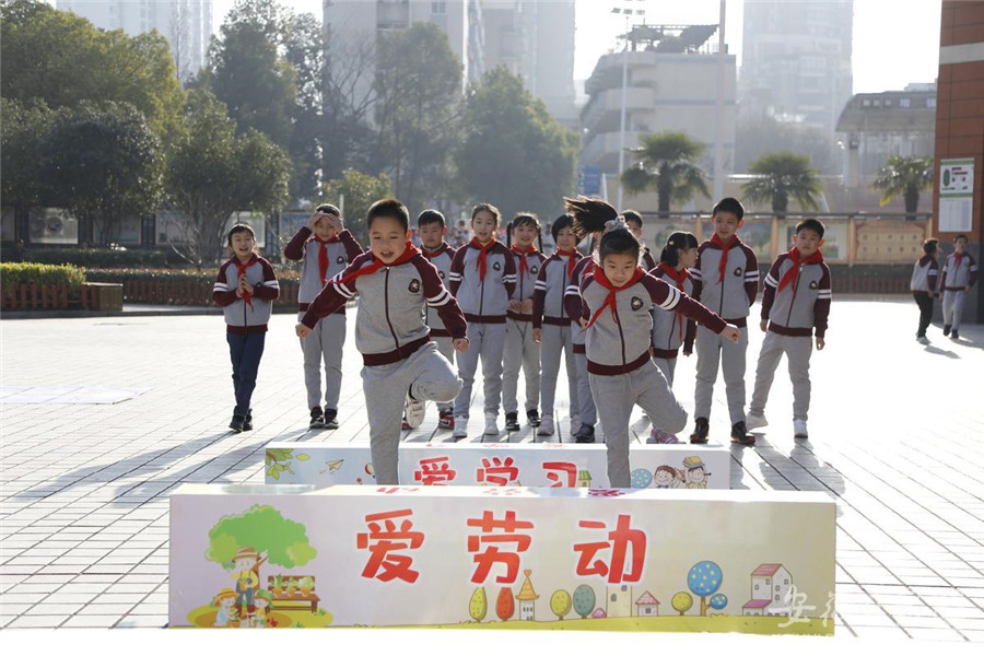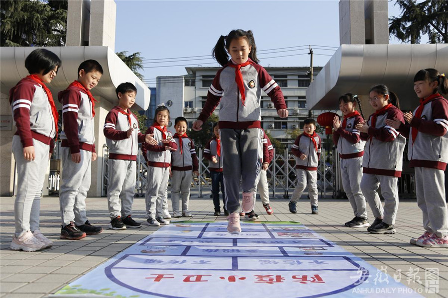 2月22日,合肥市瑶海区各中小学幼儿园师生迎来开学第一天。合肥市和平小学的第一节体育课上,老师将运动与防疫知识相结合,设计出特殊的“跳房子”游戏,让学生在快乐运动中学到防疫知识。通讯员 吴海波 摄