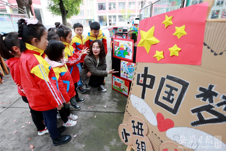 4月2日,当涂县团结街小学附属幼儿园的老师领着孩子参观画展。 当天,该幼儿园举办以《放飞中国梦 传承红基因》为主题的幼儿画展。共展出幼儿绘画作品近百幅。小班的孩子还在老师的指导下现场作画。党是阳光我是苗,孩子们用稚嫩的小手握着七彩画笔,在洁白的画纸上描绘出心目中伟大祖国的形象,画出了对党、对人民、对祖国的浓浓爱意和美好祝福。 活动不仅让幼儿体验到了绘画的快乐,也在幼小的心灵中传承了红色基因,使孩子们对党、对祖国有了更深刻的认识和感受。(通讯员 汪宗本 摄)