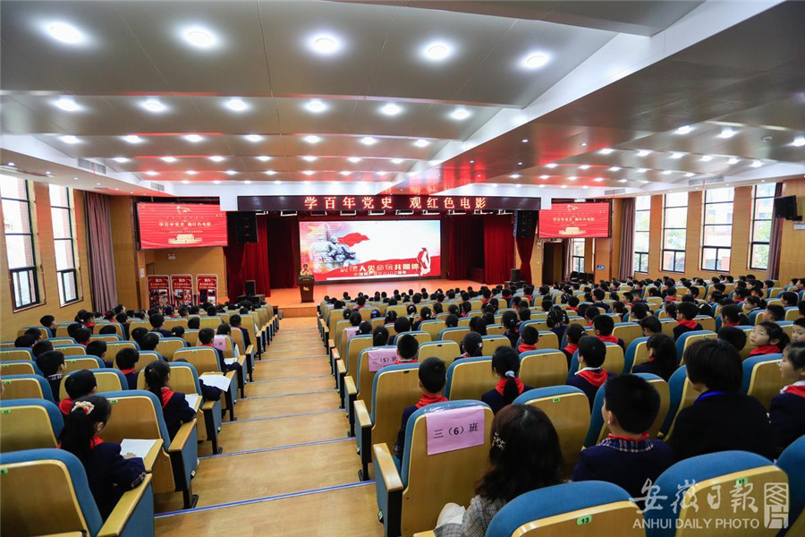4月12日,合肥市安庆路第三小学灵溪校区200名小学生正在学术报告厅聚精会神地观看电影《英雄小八路》。为进一步做好辖区中小学党史学习教育工作,合肥市庐阳区林店街道官塘社区妇联、关工委组织开展“红色电影进校园”主题活动,弘扬爱国主义精神,让小学生牢记历史,缅怀革命先驱,珍惜当今幸福生活,努力做红色基因的传承者。通讯员 赵明 摄