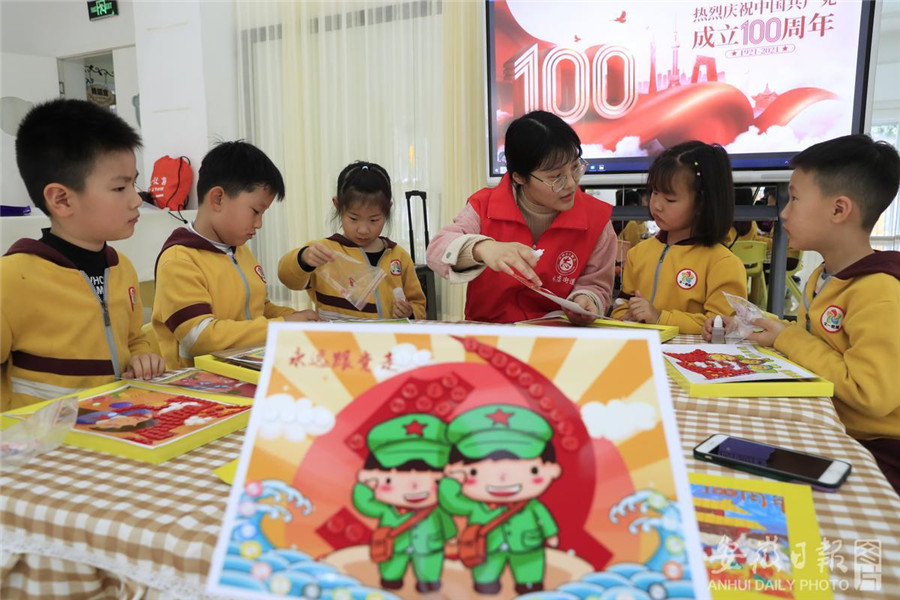 为喜迎建党100周年,4月28日下午,合肥市庐阳区林店街道菱湖社区联合创和幼教名门华府幼儿园开展了一场党史创意“纽扣画”活动。社区志愿者给孩子们讲解纽扣画的内容和制作流程,旨在培养和增进孩子们对党和祖国的崇敬之情。通讯员 赵明 摄
