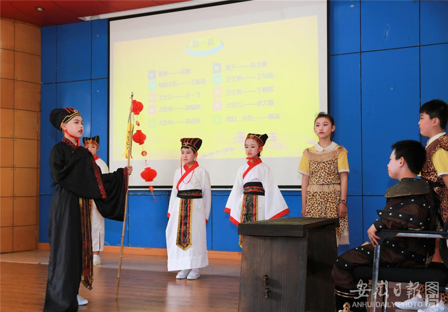 5月20日,在铜陵市田家炳小学古诗文诵读会上,孩子们正在表演历史剧《张骞出使西域》。为激发孩子们学习经典古诗文的兴趣,该校积极鼓励学生通过自编自导自演舞台剧,将不同朝代的诗、文、历史故事串联在一起,让学生们在寓教于乐的氛围中接受中华传统美德和优秀文化的熏陶,重温历史经典,提升文化内涵。通讯员 潘伟 摄