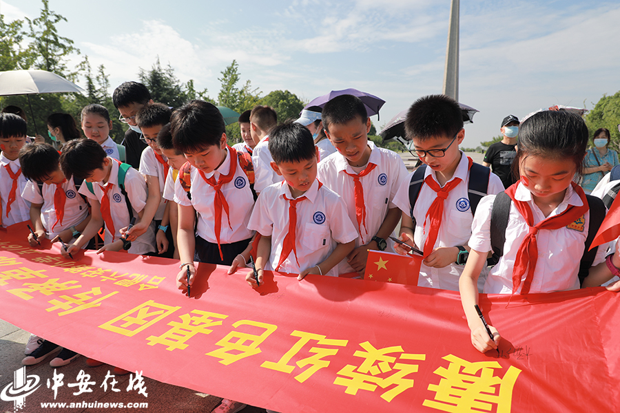 队员们首先来到渡江战役纪念馆广场,巨大的船形纪念馆主体建筑和高大的“五前委”雕像庄严肃穆,队员们怀着无比崇敬的心情,在雕像前高唱“没有共产党就没有新中国”,队员们挥舞着国旗,齐唱红歌,嘹亮的歌声响彻广场,表达了深深的爱党、爱国情怀。随后,队员们在写有“赓续红色基因,传承革命精神”的横幅上签名,表达自己的决心。少先队员代表讲了红色故事,感悟党的初心使命,增进爱党之情。
