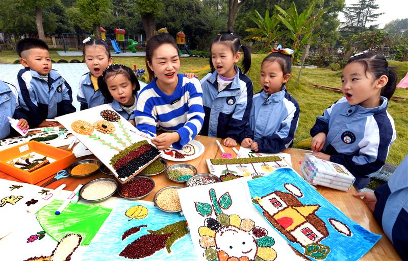 11月2日,迎江区一校园里,老师正在教小朋友们学习制作的“五谷画”。入秋以来,迎江区将“五谷画”引入校园课堂上,设为校本课程,丰富学生校园生活,让小朋友在动手操作中学会珍惜粮食,并亲身体验秋天和丰收的魅力。(记者 黄有安 通讯员 吴永畅 摄)