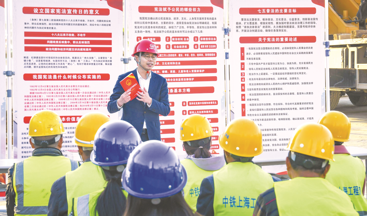 2021年12月3日,中铁上海局三公司聘请的律师在合肥轨道交通8号线清河路站建设工地开展普法活动。记者 李博 通讯员 胡静波 摄