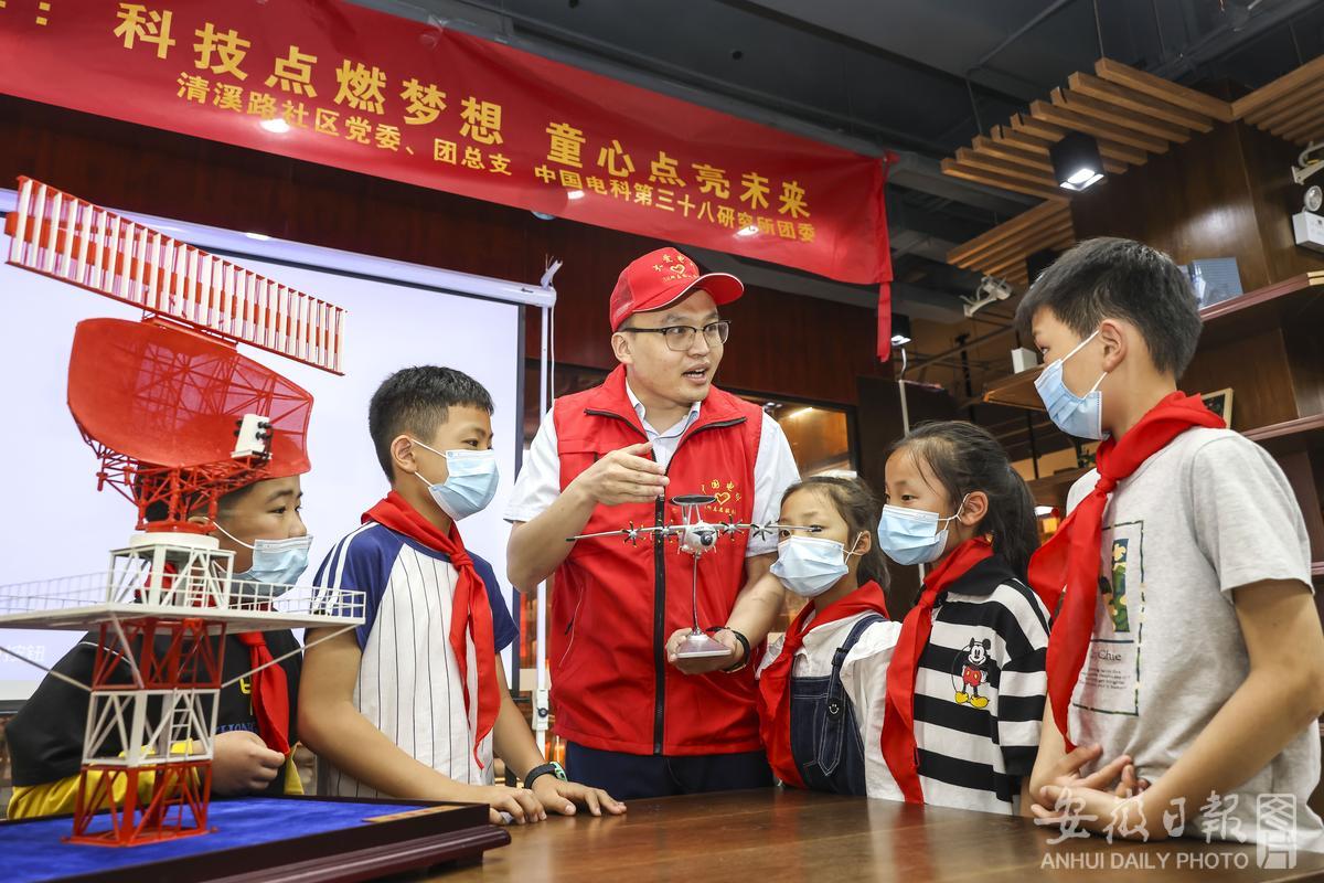 5月28日,中国电科三十八所志愿者在向孩子们讲解预警机知识。当日,合肥市蜀山区五里墩街道清溪路社区党委、团总支联合中电科三十八所团委,开展“科技点燃梦想 童心点亮未来”科普教育活动,让同学们近距离接触当前世界高新技术研究成果,激发青少年学科学爱科学的热情。