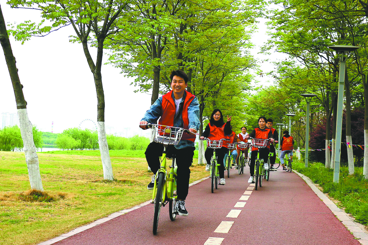 日前,宿州市埇桥区汴河街道组织志愿者在新汴河景区开展 “低碳快乐骑行 宣传绿色环保”活动,志愿者通过骑行的方式,宣传环保节能、绿色出行生活理念。通讯员 丁辉 摄