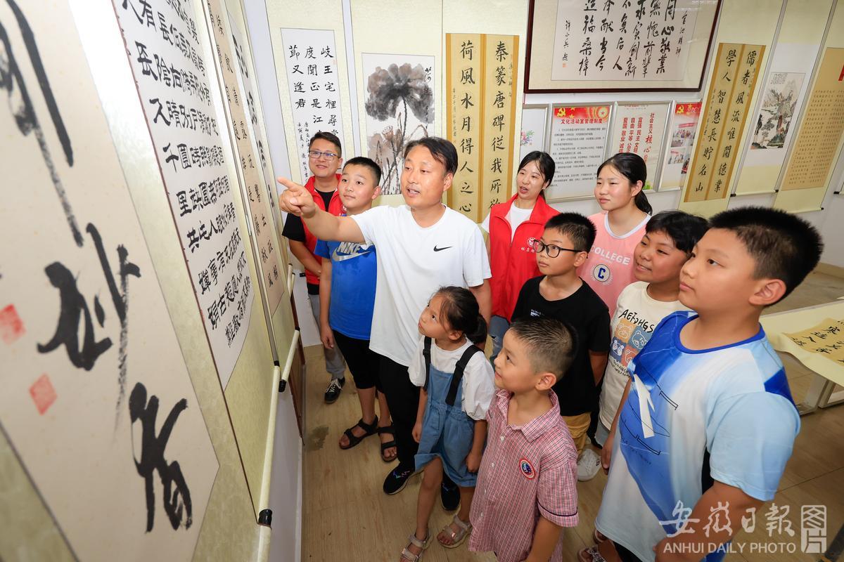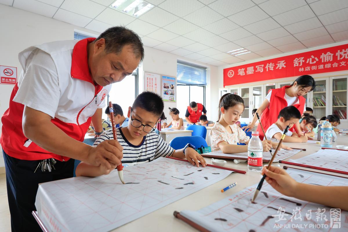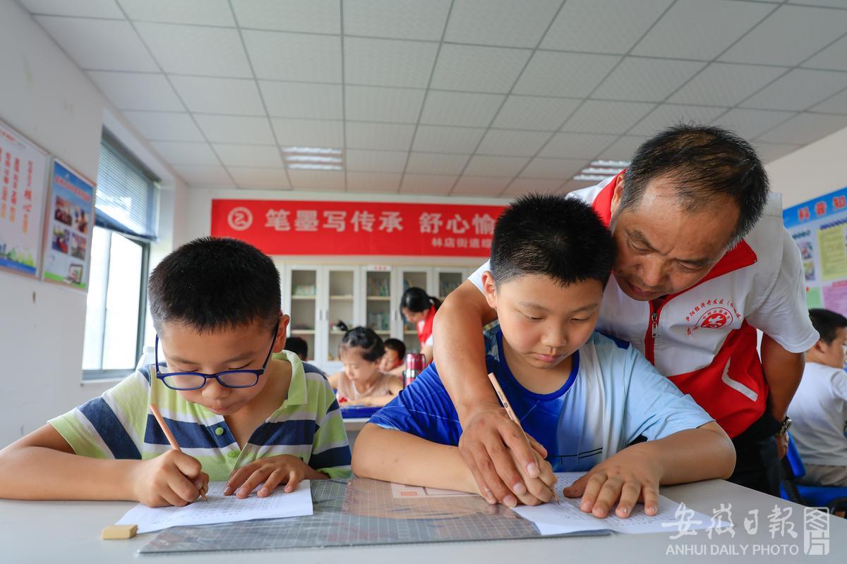 7月13日,在合肥庐阳经济开发区金池社区书画室,志愿者正在辅导孩子们练习书法。暑假来临,为解决辖区双职工子女无人看管照顾问题,该社区充分利用社区党群服务中心多功能活动室作用,招募才艺志愿者,为儿童提供为期1个月的学习辅导、书法绘画、科普体验、普法教育等内容,让孩子们度过一个快乐充实的暑假生活。通讯员 赵明 摄