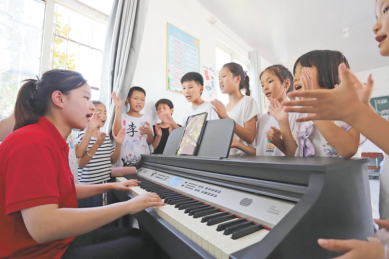 7月12日,河海大学的16名大学生志愿者来到涡阳县涡南镇圣尧小学开展乡村支教活动,教授留守儿童音乐等知识,丰富孩子们的暑期生活。通讯员 高亚男 摄