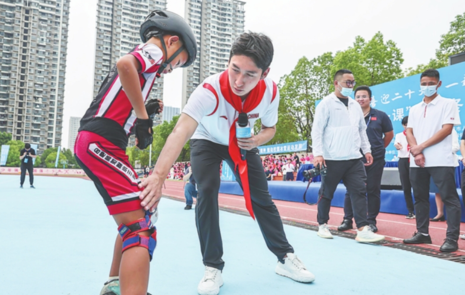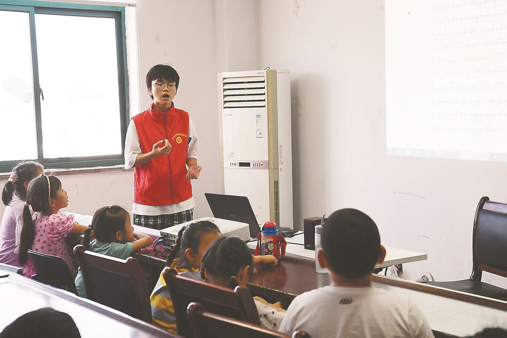 近日,武家豪在给合肥市新站区三十头社区暑期托管班的孩子们上音乐课。