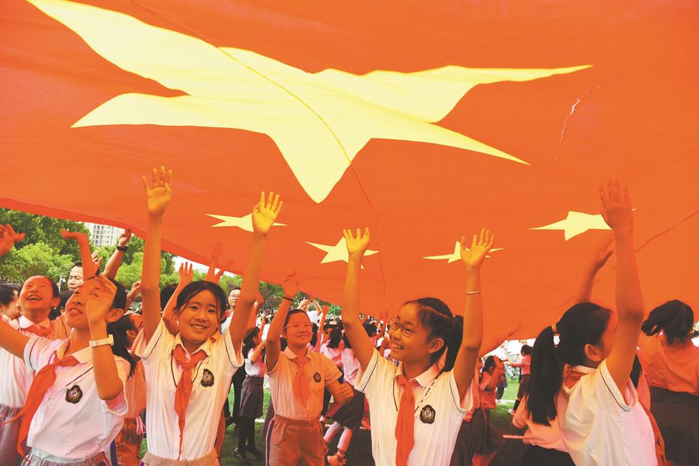 9月29日,在铜陵市义安区实验小学操场,学生们开展“我和国旗合个影”“我有话对祖国说”活动,表达对伟大祖国的热爱和美好祝福,喜迎国庆节。通讯员 陈晨 摄