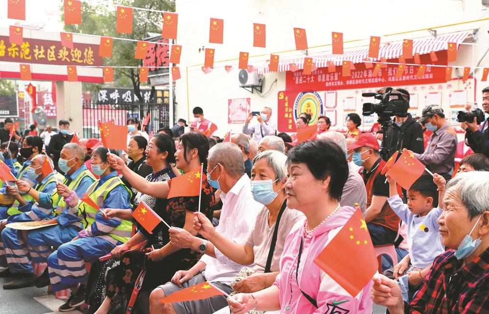 9月29日,在滁州市琅琊区琅琊街道凤凰社区市民文化广场,老人们挥舞国旗观看文艺节目,喜迎国庆、重阳两节到来。通讯员 李晓村 摄