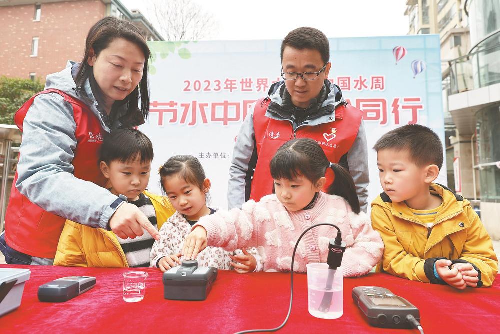 3月20日,合肥供水集团第二水厂的水质检验员向小朋友们和居民演示普通水如何经过沉淀、消毒等一系列工艺流程变成自来水的过程,培养居民“爱水、节水、护水”意识。记者 范柏文 摄