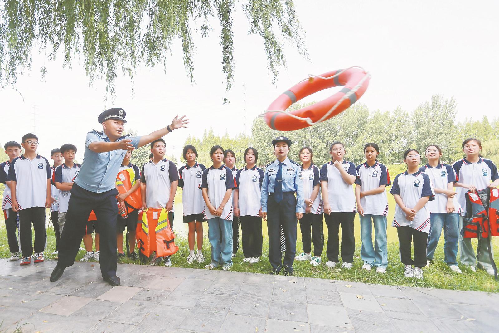 6月27日,在淮北市萧濉新河岸边,公安民警为学生宣传防溺水知识。 暑假即将到来,淮北市公安局相山公安分局三堤口派出所联合淮北市第五中学开展暑期防溺水主题安全教育活动,提高孩子们的安全意识和自救能力。