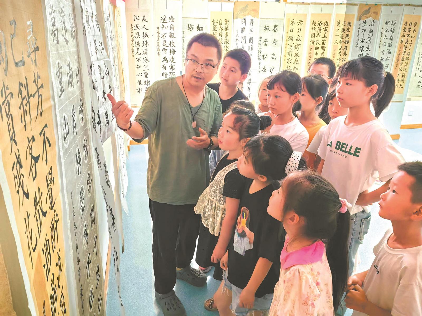 7月14日,在黄山市徽州区图书文化馆,文化志愿者向孩子们介绍书法知识。近日,徽州区未成年人文化艺术公益免费培训班开班,让孩子们在丰富多彩的文化活动中学才艺、享书香。通讯员 曹晓东 摄