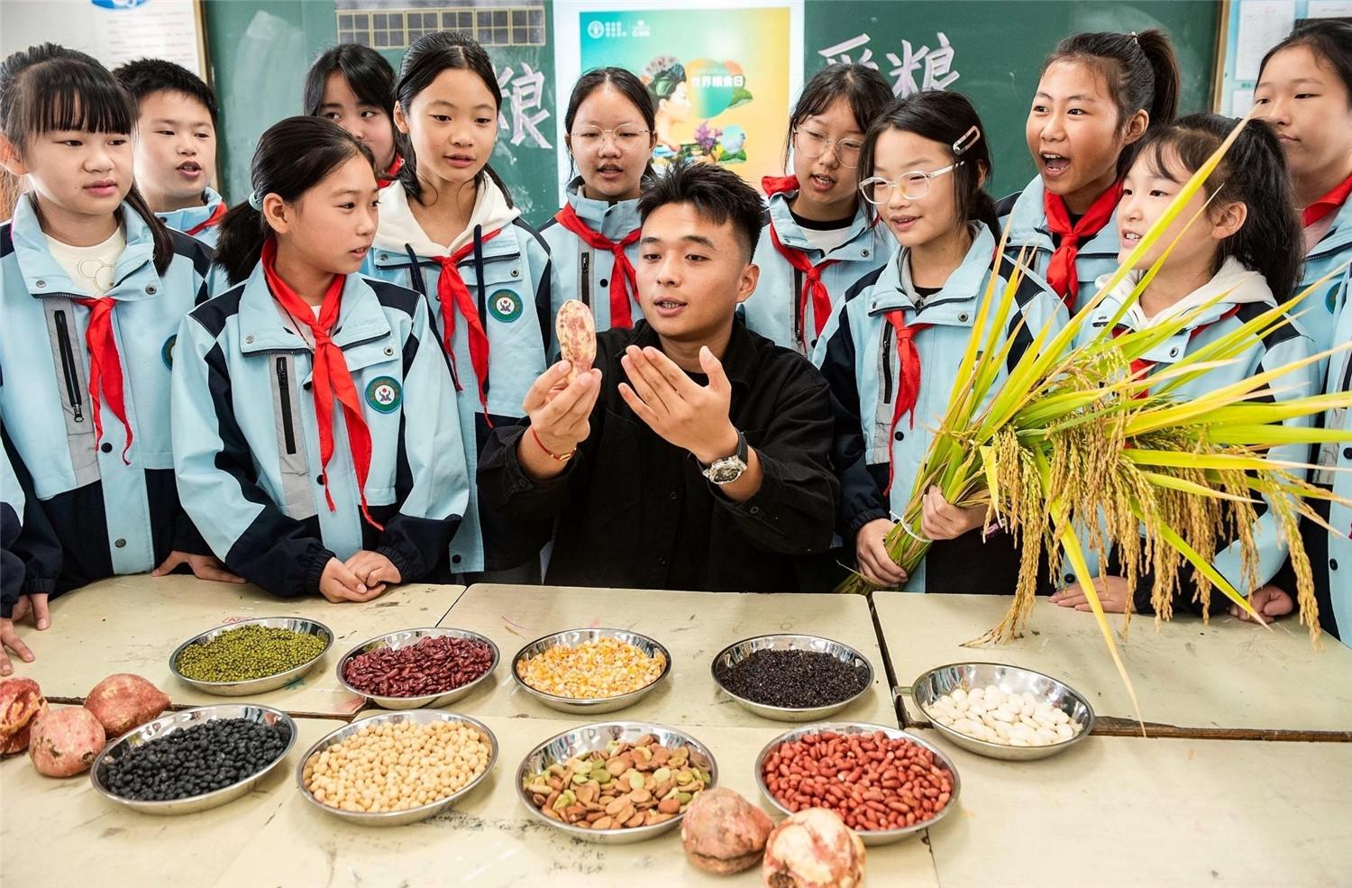 10月14日,含山县姚庙中心学校的老师在给学生讲解粮食知识。该校开展“爱粮节粮 从我做起”主题教育活动,通过实物展示、现场讲解等方式,引导孩子体会粮食来之不易,从小养成节粮、爱粮、惜粮的意识,迎接10月16日“世界粮食日”的到来。