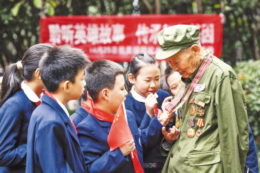 今年89岁的抗美援朝老兵杨克美在向孩子们讲述英雄故事。10月25日是中国人民志愿军抗美援朝出国作战74周年纪念日,19日,合肥市庐阳区逍遥津街道人武部联合六安路小学开展了“聆听英雄故事 传承红色基因”主题教育活动。通讯员 徐伟 摄