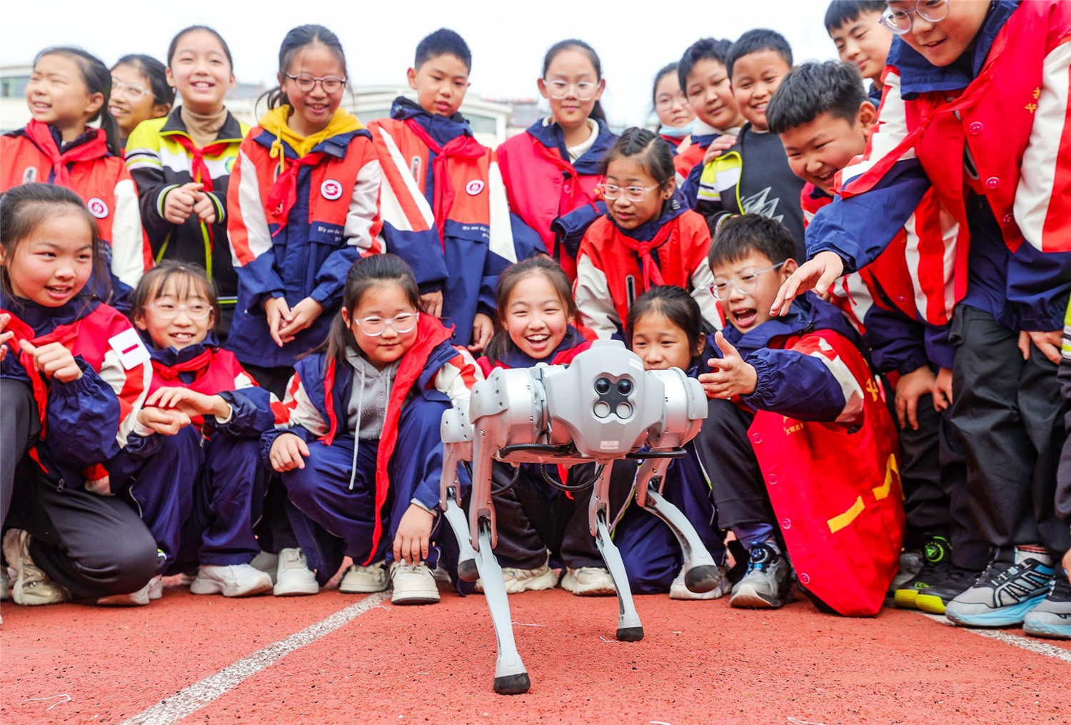 11月11日,淮北市第五实验小学校园科技节活动上,同学们在观看“机器狗”表演。科技节上,通过科普讲解、互动体验等方式,让学生零距离感受科技的魅力。本报通讯员 冯树风 王心杰 摄