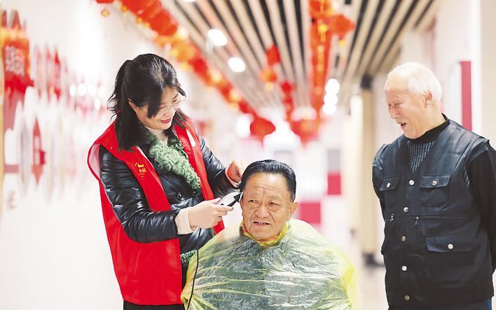 3月5日,肥东县长临河镇新时代文明实践所,志愿者为辖区老人义务理发。 通讯员 陈振 摄