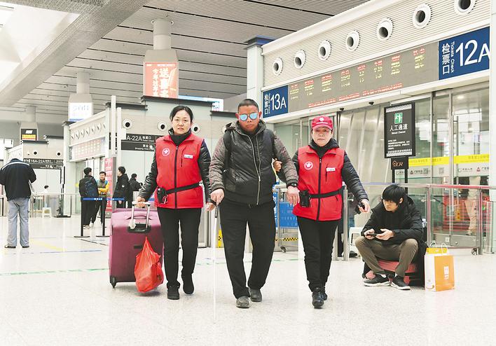 3月5日,在合肥南站,志愿者搀扶视障人士出站。 合肥日报-合新闻记者 郭如琦 摄