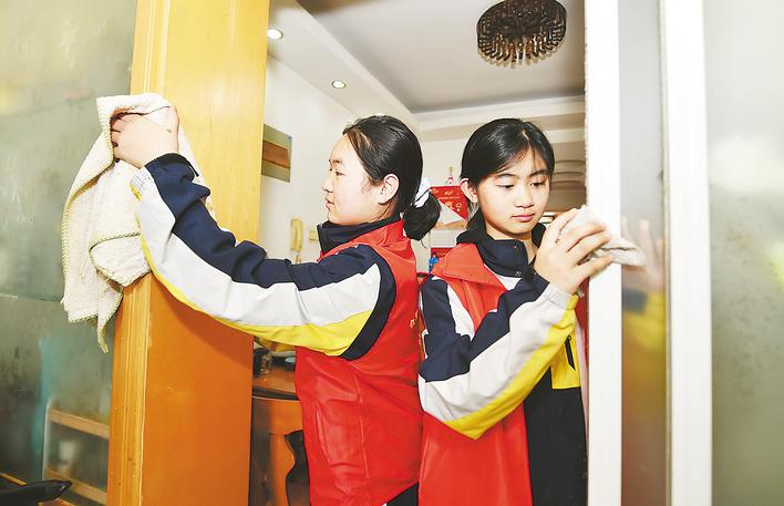3月2日,在合肥市金都华庭小区,中学生志愿者帮助老人打扫家庭卫生。 通讯员 葛传红 摄