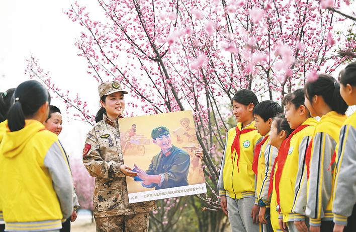 3月1日,肥西县紫蓬镇民兵在向学生讲述雷锋故事。 通讯员 徐伟 摄