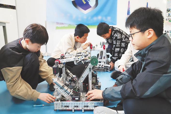 3月22日,在合肥市第三十八中学北校,机器人社团的学生正专注训练。为了让学生在机器人领域收获更多知识与技能,该校社团辅导老师们利用节假日和午间休息时间,悉心指导学生。