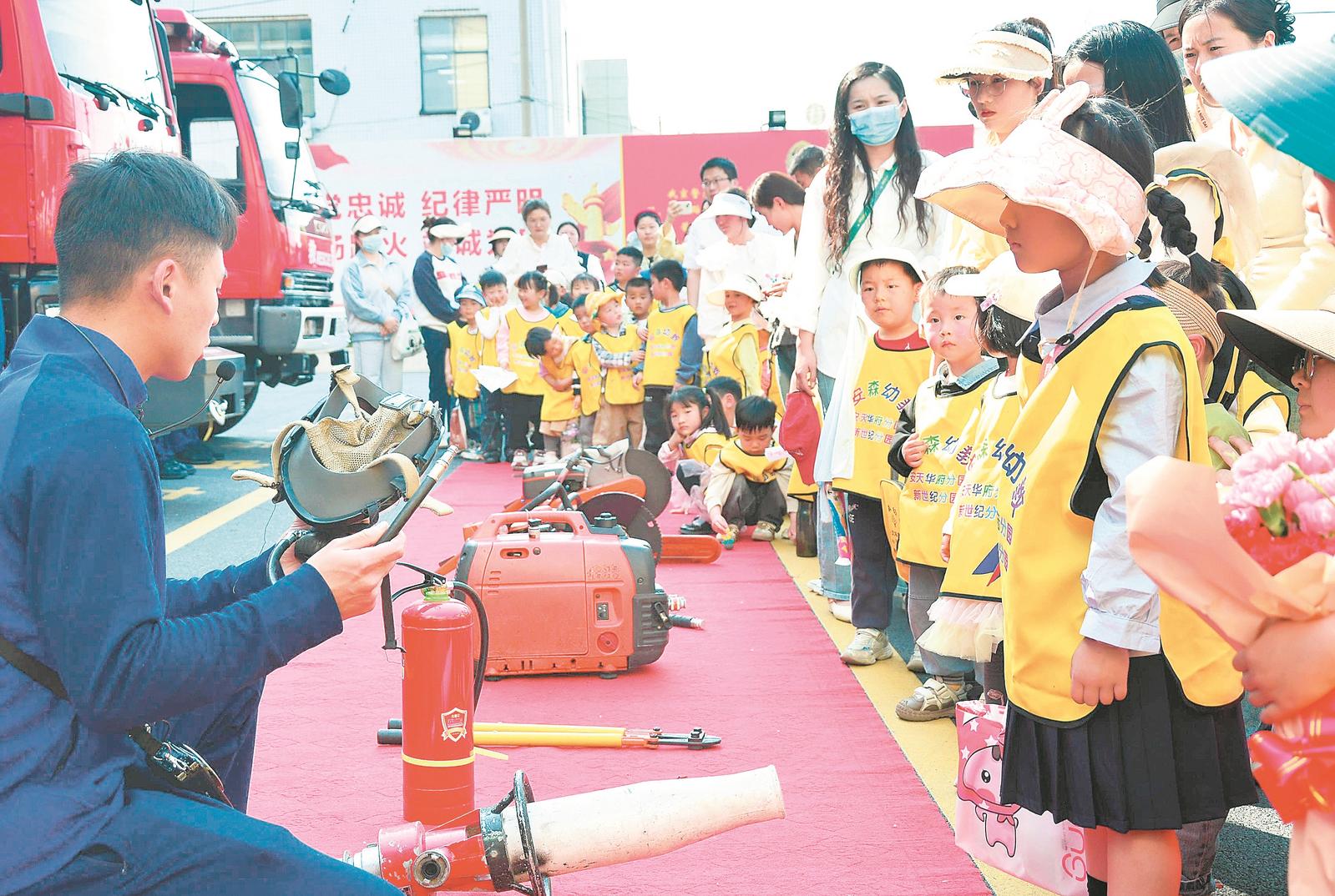 3月26日,霍邱县蓼城路消防救援站迎来了一群小朋友,一起体验“红门”生活,学习消防安全知识。消防救援人员为师生讲解各种车辆器材的性能、功能用途及使用方法。通讯员 赵海云 摄