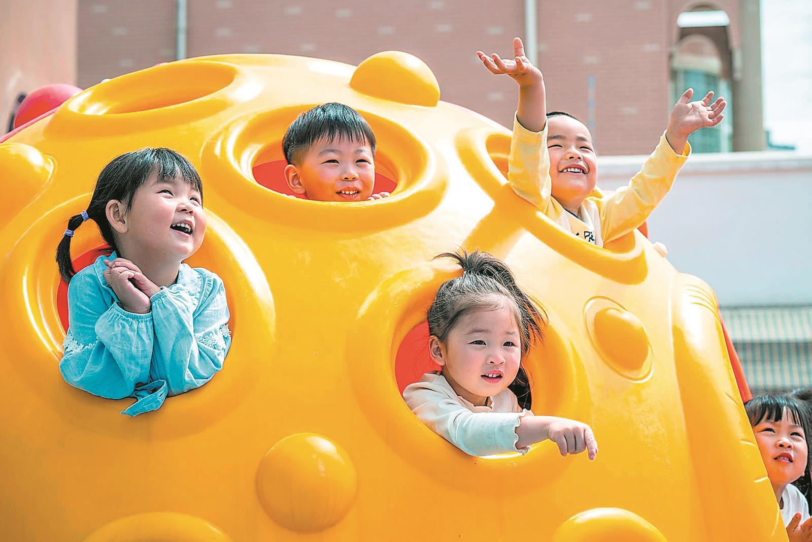 4月16日,在芜湖市繁昌区繁阳托育服务中心,孩子们在老师的精心照护下玩游戏。