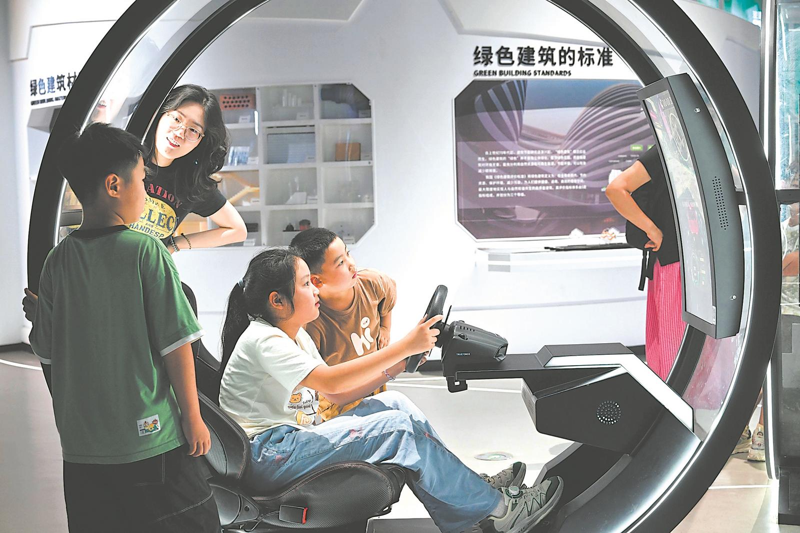6月26日,在安徽省科技馆新馆,小朋友们在“新能源赛车场”上比拼。