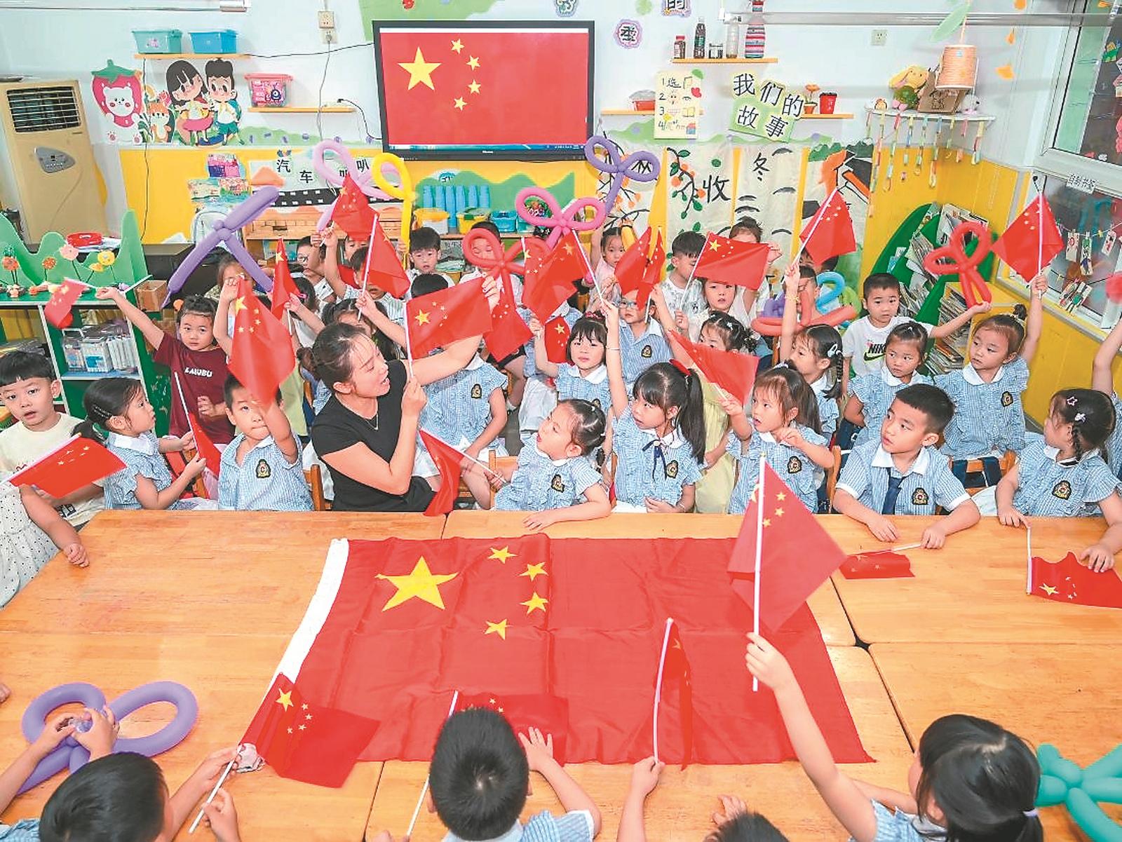 9月1日,在马鞍山市和县培贤幼儿园,老师在给孩子们讲解国旗的故事,并教唱国歌,让爱国主义精神代代相传。 通讯员 秦祖泉 摄