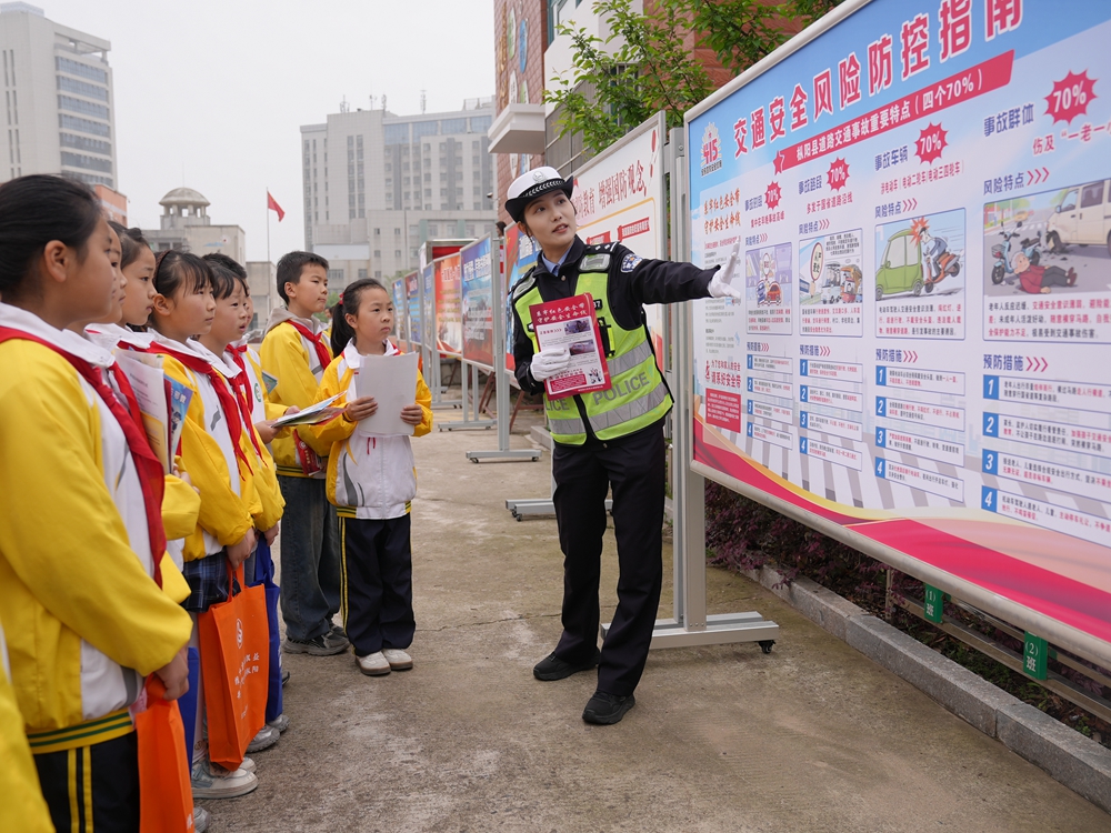 4月15日,枞阳县旗山小学,交警向学生宣传讲解全民国家安全教育相关知识。当日,枞阳县组织公安、教育等部门联合开展“国家安全教育进校园”活动,向学生们普及国家安全相关法律法规知识,增强学生们对总体国家安全观的认识,共筑国家安全防线。(枞阳在线 王章志摄)