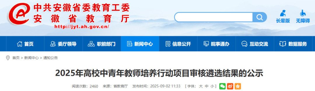 根据《中共安徽省委教育工委 安徽省教育厅关于开展2025年度高校中青年教师培养行动项目申报工作的通知》(皖教工委函〔2025〕84号)安排,经个人申报、校级评审推荐、省级审核遴选等程序,肖翔等110人拟入选学科(专业)带头人培育项目,易启毅等203人拟入选青年骨干教师境内访学研修资助项目,王晴等43人拟入选青年骨干教师境外访学研修资助项目,张琼等100人拟入选优秀青年教师培育重点项目,刘晓丽等224人拟入选优秀青年教师培育一般项目。现予以公示。
