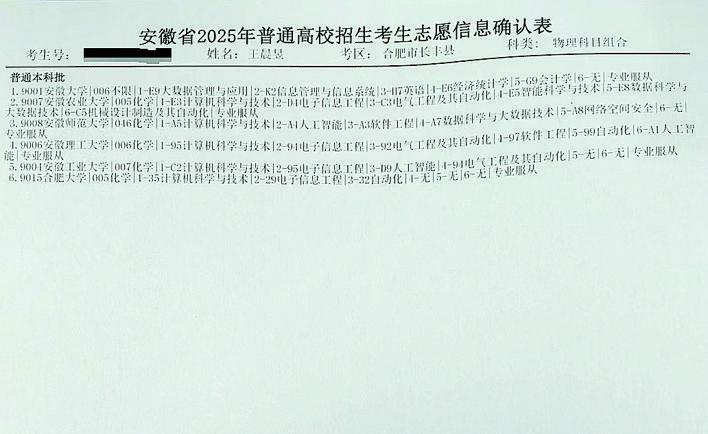 对于高考志愿填报,王晨昱有着自己的想法,“我想留在家乡读书,毕业后留在合肥工作。在专业上,我对计算机和人工智能比较感兴趣,也有可能会选择学外语。”7月6日,王晨昱完成了志愿填报,第一志愿选择了安徽大学、第二志愿选择了安徽农业大学。