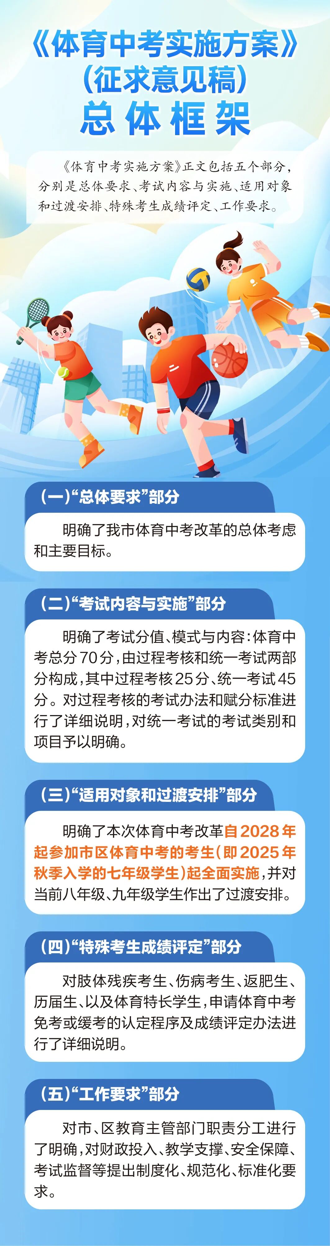 为进一步完善市区初中学业水平体育与健康学科考试(以下简称“体育中考”),构建与新时代学校体育发展相适应的评价体系,切实发挥以体育人导向作用,根据合肥市中考改革总体部署,立足合肥市实际,经广泛调研、深入研究和评估论证,合肥市教育局起草了《合肥市市区初中学业水平体育与健康学科考试实施方案(征求意见稿)》(以下简称《体育中考实施方案》)。体育中考有什么变化?你关心的答案都在这里——